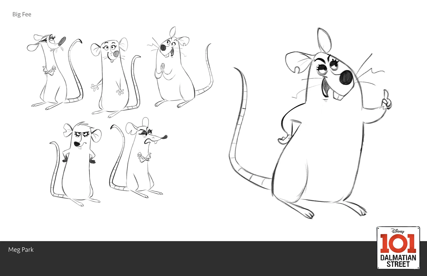 Big Fee is a wisecracking, mischevious rat who frequently appears with Fergus and Sid. She is skilled in negotiating, manipulating, and scheming. She has hot pink hair and tattoos of flowers, hearts, and stars on her body. In concept art, however, Big Fee wasn't shown with these traits. An official description of the character explains her name: "Big Fee can get you anything for, well, a big fee."[1] Big Fee serves as a supporing player in 101 Dalmatian Street's cast, usually seen making witty remarks with Sid.